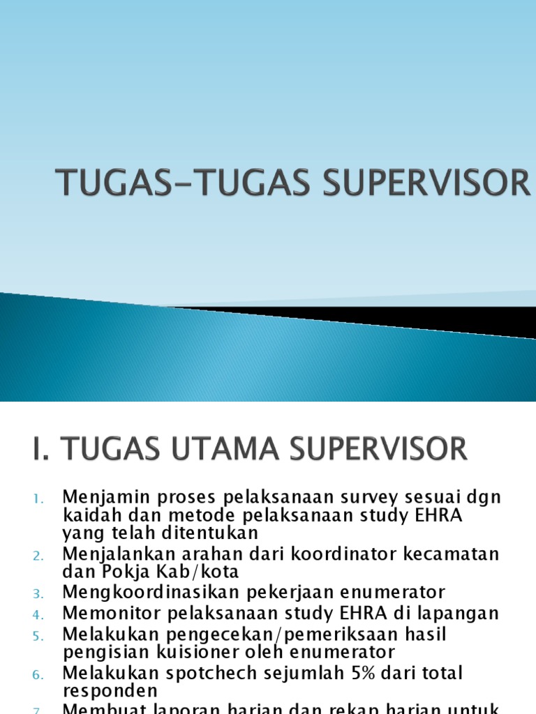 Peran seorang supervisor dibilang cukup penting karena secara hurufiah tugas supervisor adalah sebagai pengawas dan pengarah supervisor adalah. Supervisor adalah seseorang yang diberikan tangung jawab untuk mengontrol dan membawahi kariawan dalam perusahaan.
