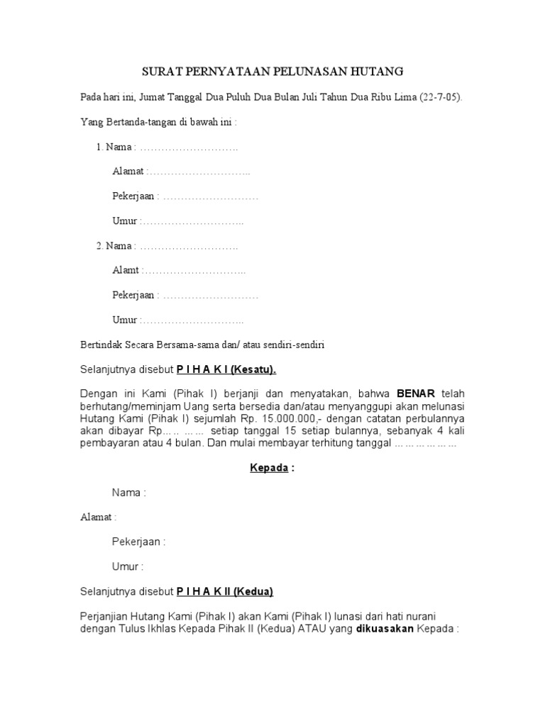 Kalian bisa contoh surat permohonan percepatan pelunasan berikut ini atau. Surat perjanjian cicilan hutang format 728 x 1031 contoh pelunasan utang format 768 x 1024 pixel download contoh surat perjanjian hutang piutang sederhana dengan format 382 x 500 pixel download doc surat pernyataan pelunasan hutang wanto sahabat format 600 x 988 pixel. Doc surat pernyataan pelunasan hutang piutang vina. Contoh surat permohonan payroll ke bank. Berikut ini adalah contoh surat permohonan pelunasan hutang melalui kta/kredit tanpa contoh surat untuk diajukan kepada universitas untuk memperoleh surat keterangan lulus atau sklfull 2.