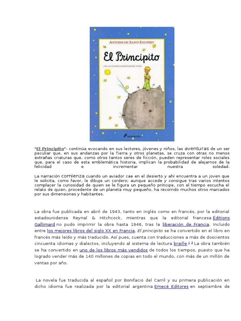 Un hombre simpática, un piloto, naufragó el principito: En el libro, un aviador se encuentra perdido en el desierto de sahara, después de que su avión se averiara. Resumen del libro el principito inicio desarrollo y final. En el libro vemos la importancia de tantos temas como la amistas, el amor, la paciencia, desarrollando en cada personaje personalidades con rasgos que nos. Se trata de un final que en principio puede parecer cerrado si tomamos como fin la muerte del principito bajo la mordedura de la serpiente.